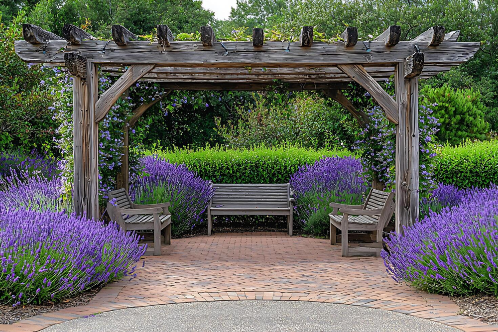 Просторное патио с деревянной перголой, оплетённой вьющимися растениями, создаёт желанную тень. По обеим сторонам перголы разбиты клумбы с пышными кустами лаванды, излучающей мягкий аромат и фиолетово-серебристый цвет – характерный акцент в скандинавском стиле, адаптированном к южному климату. Под перголой расположены простые деревянные скамейки, навевающие уют (хюгге) и располагающие к отдыху в прохладной тени.